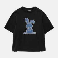 The Holy Crunch T-shirt captures a surreal moment of indulgence — a divine bunny mid-bite, carrot in hand, unbothered and unapologetic. Stitched in rich blue denim and framed by bold embroidery, it’s more than cute. It’s cult-worthy. A symbol of chaos, craving, and quiet rebellion.