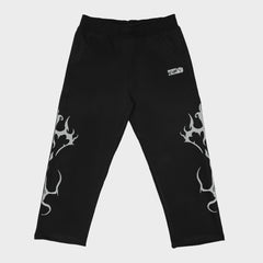 Unleash your inner fire with the Infernal Flow sweatpants by TrueGods. Crafted from 350 GSM pure looper cotton, these black straight-fit sweatpants feature fluid flame graphics wrapping around each leg — a symbol of motion, energy, and divine rebellion. Designed with cross-pockets, a single back pocket, and a clean hem finish, they deliver everyday comfort with premium construction.