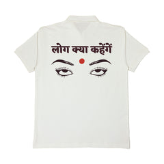 Turn heads with the Log Kya Kahenge Polo from Truegods, a bold graphic polo that blends Indian streetwear culture with premium craftsmanship. Featuring watchful eyes, a red bindi, and the powerful phrase “लोग क्या कहेंगे”, this design is a fearless take on self-expression.