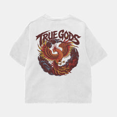 The Last Flame T-Shirt features one of our boldest visuals yet—a fiery phoenix erupting from smoke and ash, crowned by the words “True Gods” in an arresting gothic font. Caught in the chaos of destruction and renewal, this divine creature embodies the eternal cycle of endings and awakenings.